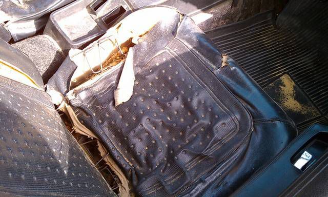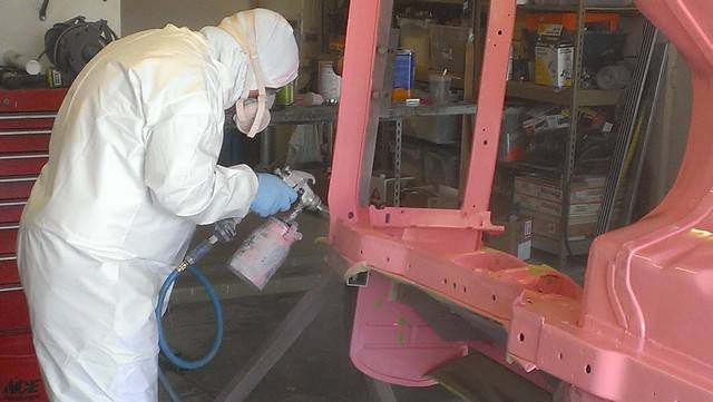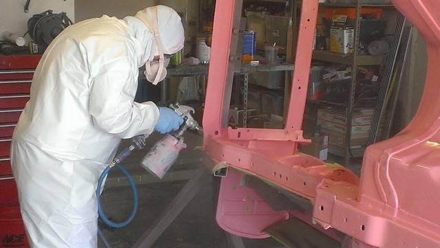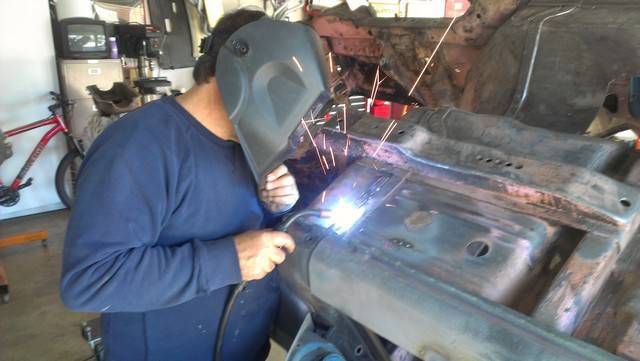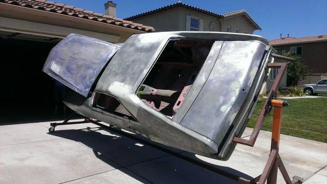 After the Playmate AMX's sale in July, 2010 it was placed in storage for 2 years while a plan was developed how to best restore the car. In June of 2012 it was moved to a fellow club member's home where it was disassembled with the help of 8 other club members. Over the next 6 months a rotisserie was built for the car, and extensive work on the body began. The lower right quarter inner and outer panels were replaced. Holes were filled in the floor pan, and other various sheet metal panels were straightened. The job of cleaning the undercoating began. It was a slow process.