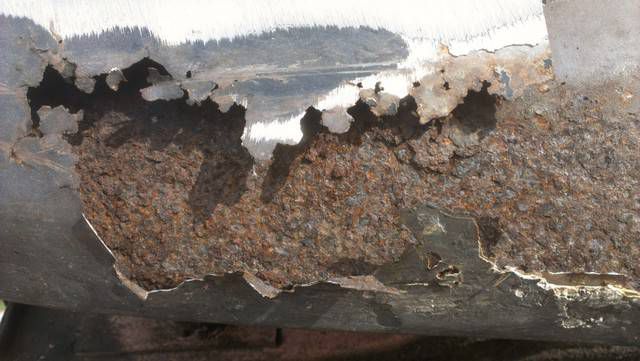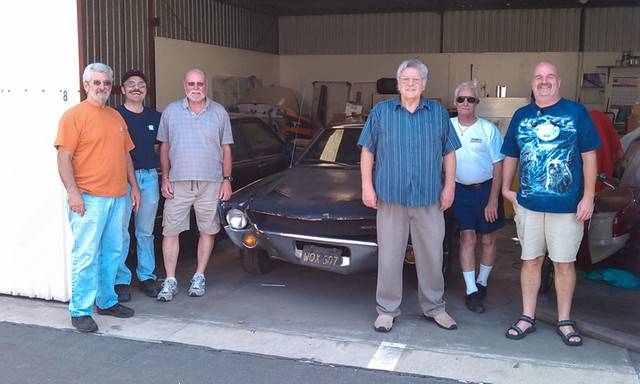 After the Playmate AMX's sale in July, 2010 it was placed in storage for 2 years while a plan was developed how to best restore the car. In June of 2012 it was moved to a fellow club member's home where it was disassembled with the help of 8 other club members. Over the next 6 months a rotisserie was built for the car, and extensive work on the body began. The lower right quarter inner and outer panels were replaced. Holes were filled in the floor pan, and other various sheet metal panels were straightened. The job of cleaning the undercoating began. It was a slow process.